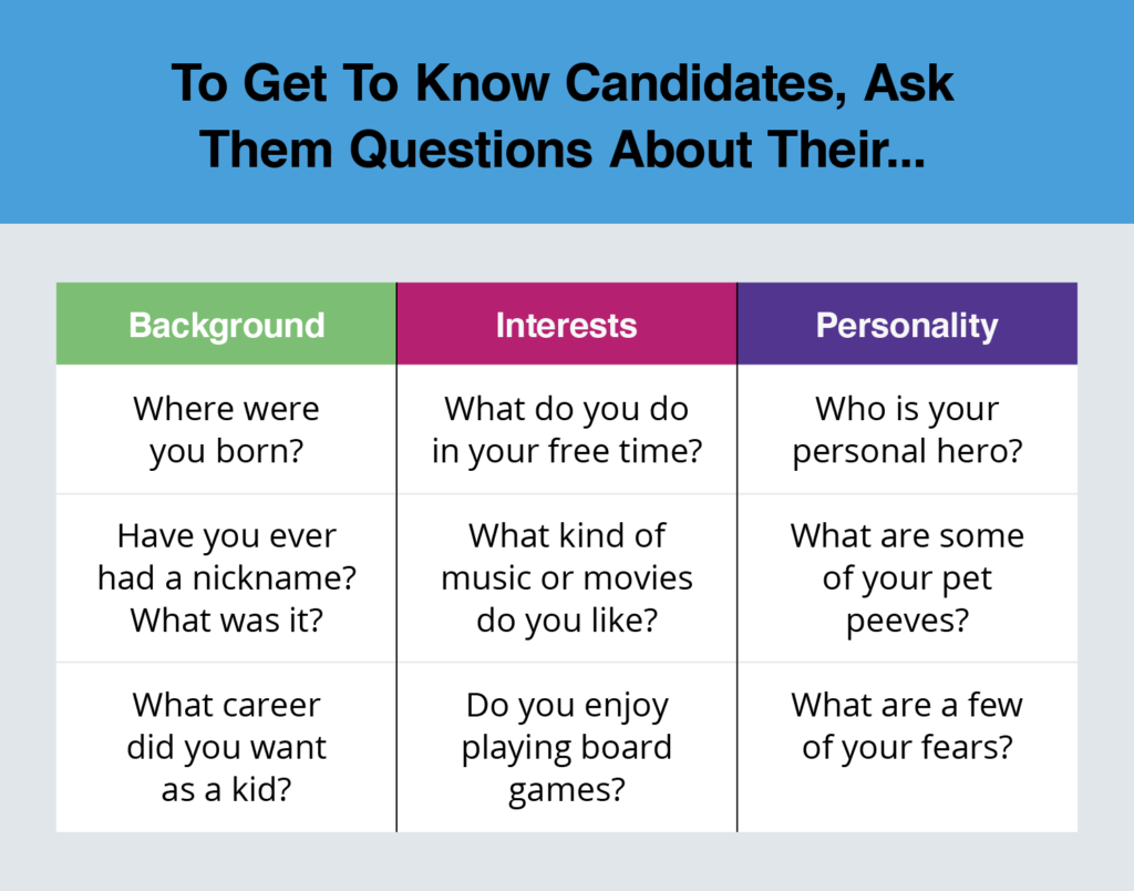 Tip: Relatability goes a long way. If you relate to the candidate, let them know. It’ll help bring their guard down and make them more comfortable.