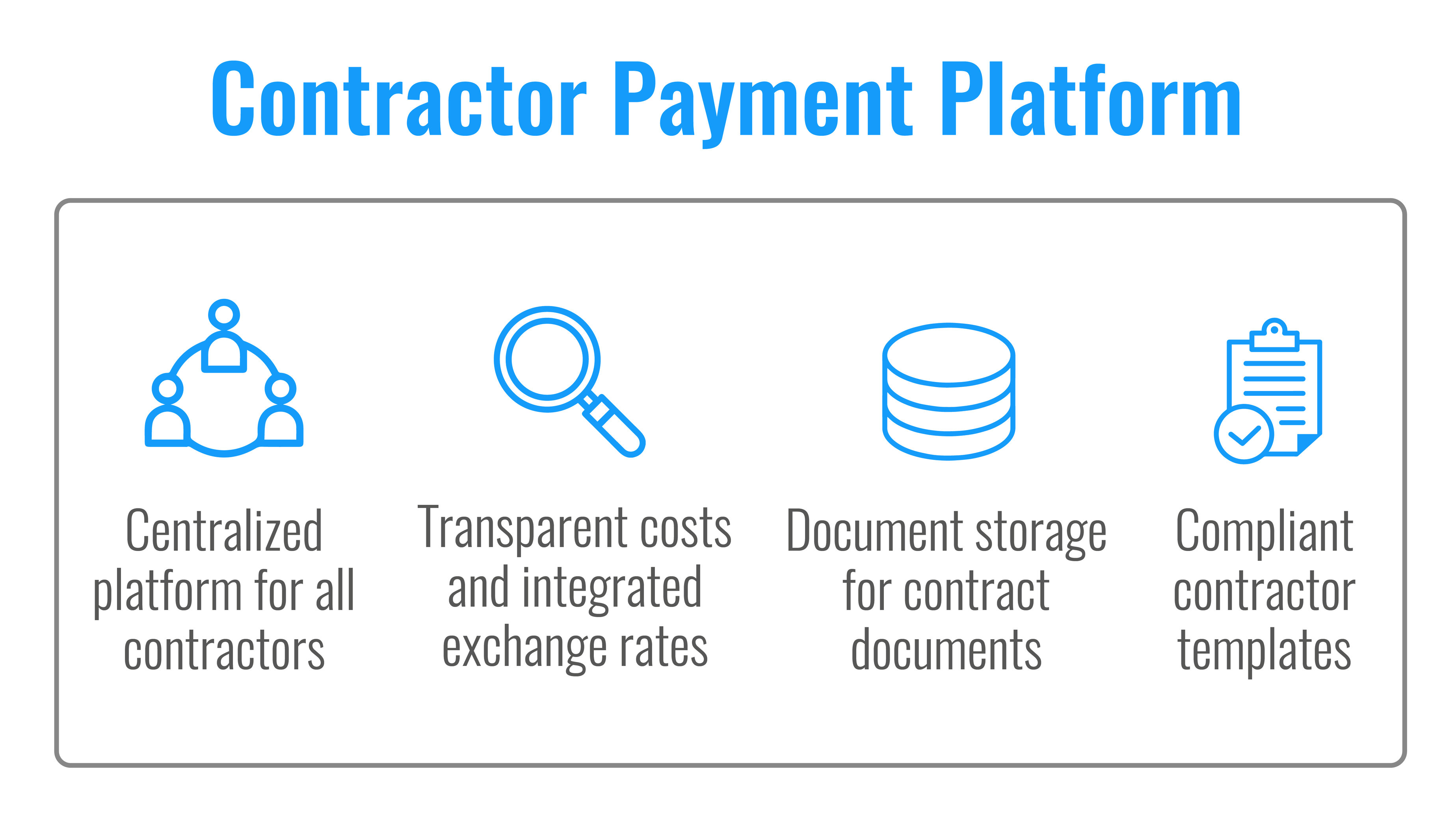 Global companies use contractor payment platforms to pay contractors across international markets. Contractor payment platforms are secure and straightforward. Some platforms automatically pass on foreign exchange fees into the contractor’s compensation. Other platforms provide a separate line item as a part of monthly invoicing, making it easy for companies to pay contractors in Canada.